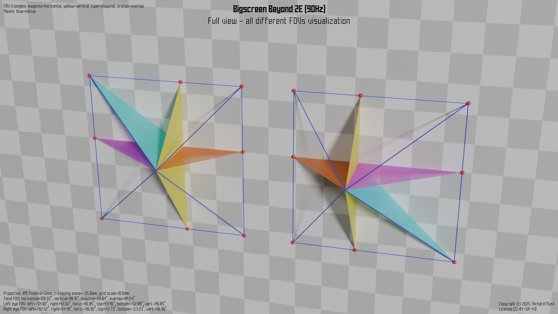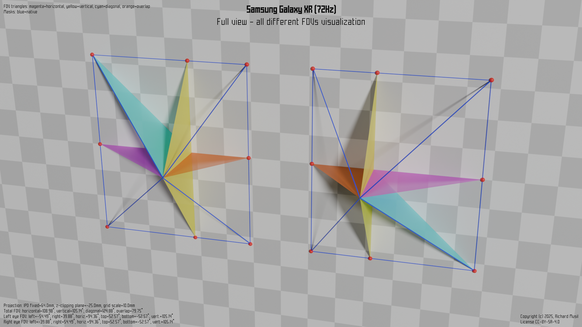 FOV diag.: Total (stereo) diagonal FOV, i.e. the angular range visible in a “diagonal plane”. See the Full view images for the visualization of the diagonal plane. Intuitively this one should be bigger than the total horizontal FOV, but practically it is sometimes reduced by the HAM.